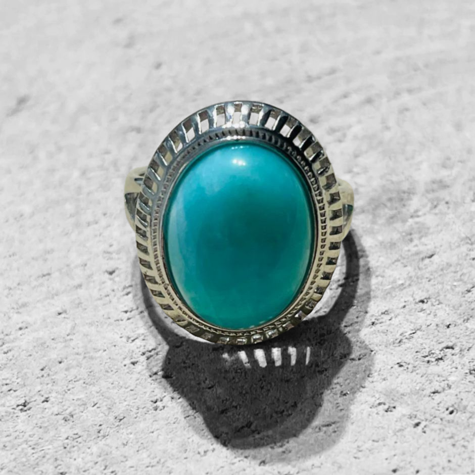Notre jolie bague artisanale est sertie d’un cabochon Amazonite.