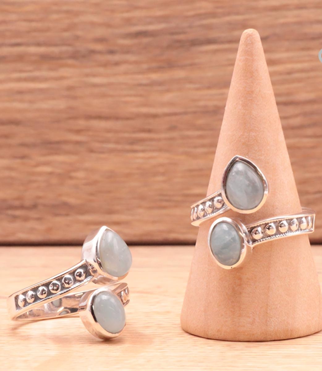 Notre jolie bague artisanale est sertie de pierres d' Aigue Marine.