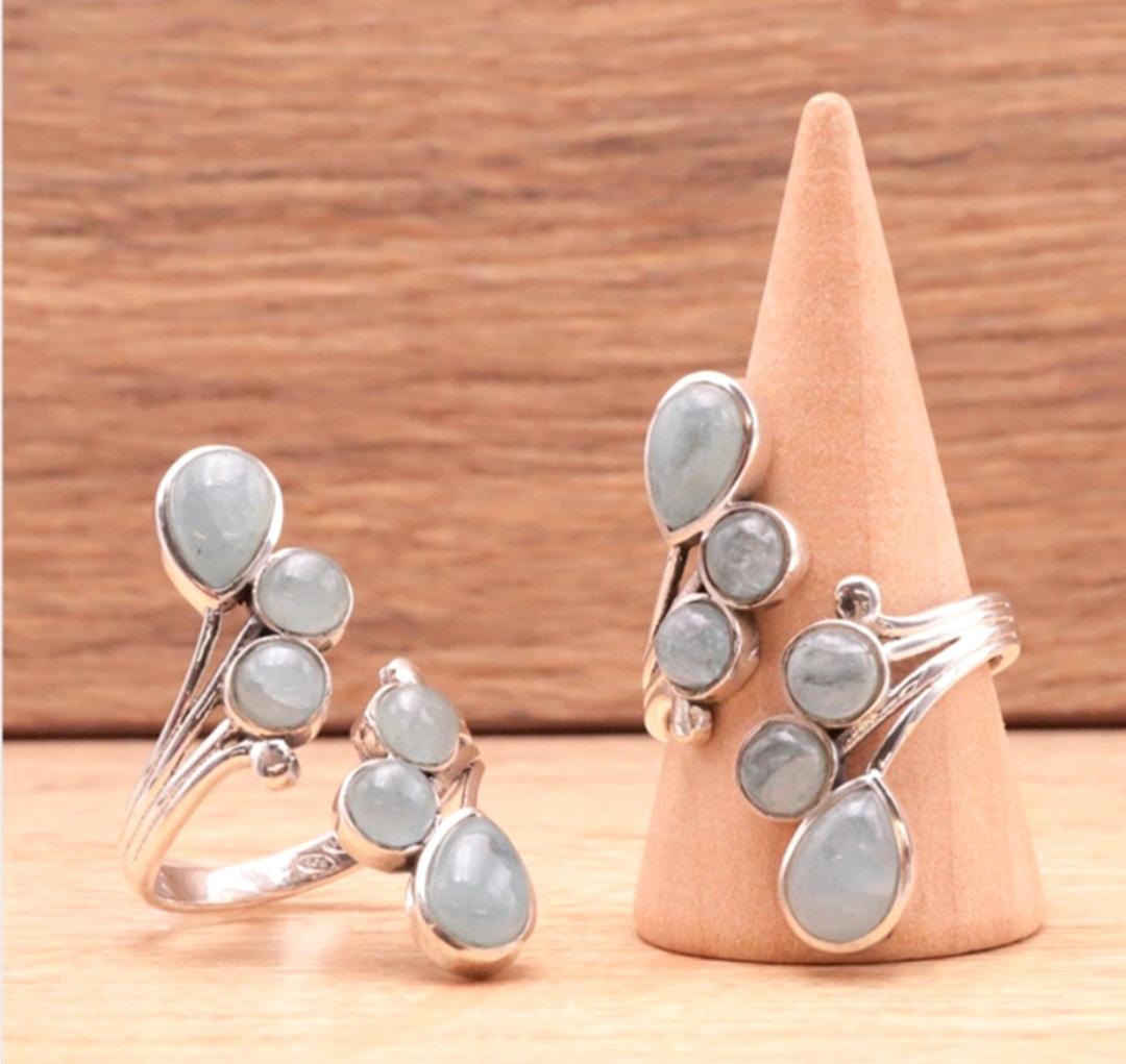 Notre jolie bague artisanale est sertie de pierres d' Aigue Marine.