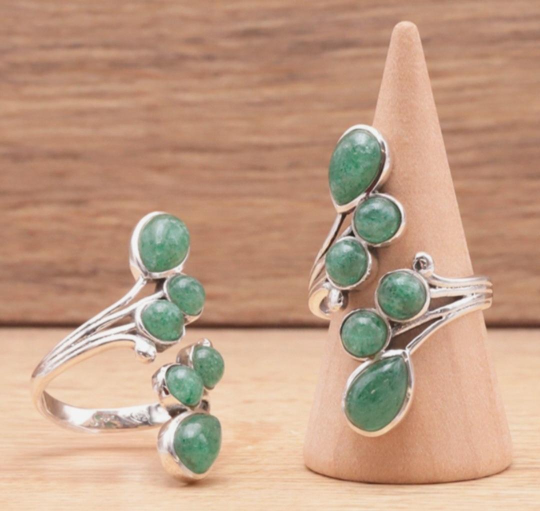 Notre jolie bague artisanale est sertie de pierres d'Aventurine verte.