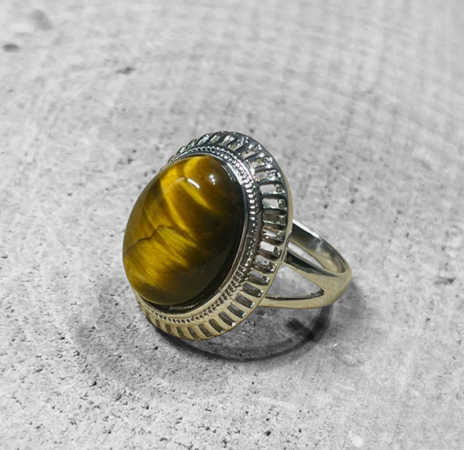 Notre jolie bague artisanale sertie d’un cabochon oeil de tigre.