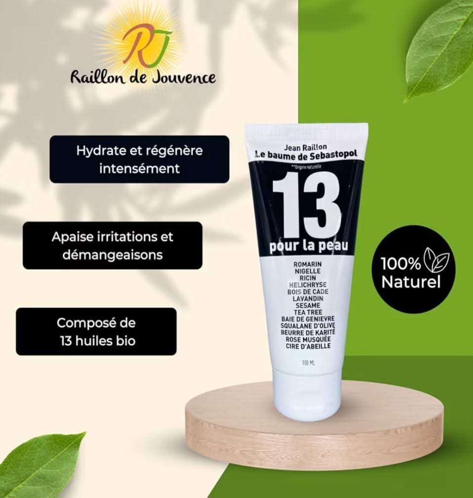 Le baume de Sebastopol JCM n°13 est la toute dernière crème mise au point par Jean Raillon. Elle ne contient que des composants naturels ainsi que des huiles essentielles bio pour aider a l’hydratation de votre peau.