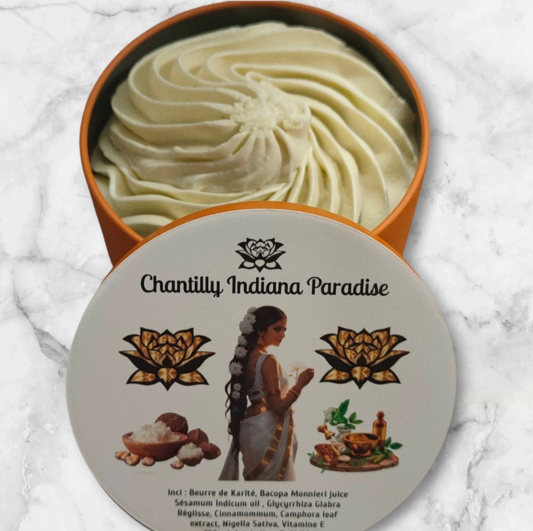 La Chantilly Indiana Paradise nourrit votre peau et lustre vos cheveux grâce à sa formule à base de Karité et l'huile ayurvédique Indiana Paradise de première qualité.