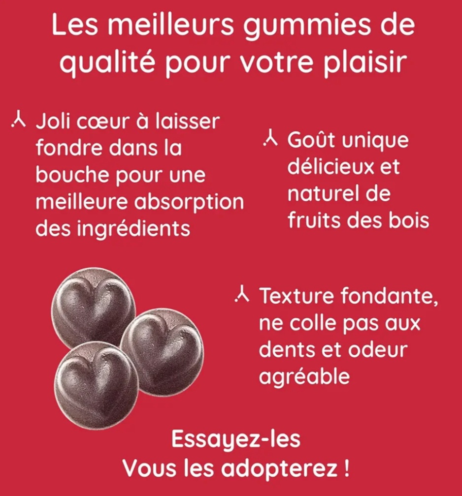 2 gummies par jour au délicieux goût de fruits des bois.